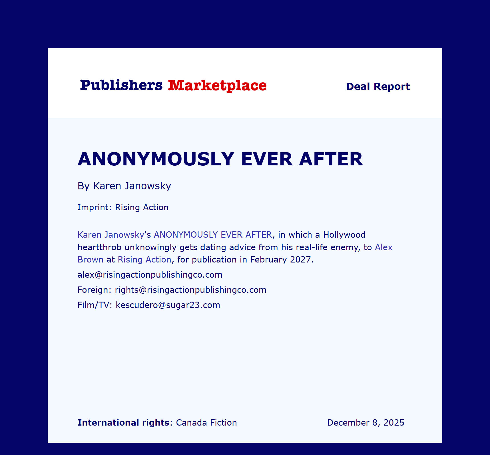 a home with Rising Action Publishing! I am over the moon excited. Anonymously Ever After is a Hollywood heartthrob and the youngest ever "Sexiest Man Alive," and a set designer in her early thirties. They can't stand each other, but they're also falling in love (they'd never admit that). The actor anonymously seeks advice from an online advice columnist, and "his" advice seems to work. Except, the columnist is the costume designer, and she has no idea that she's instructing the most irritating man she's ever met on how to seduce herself.